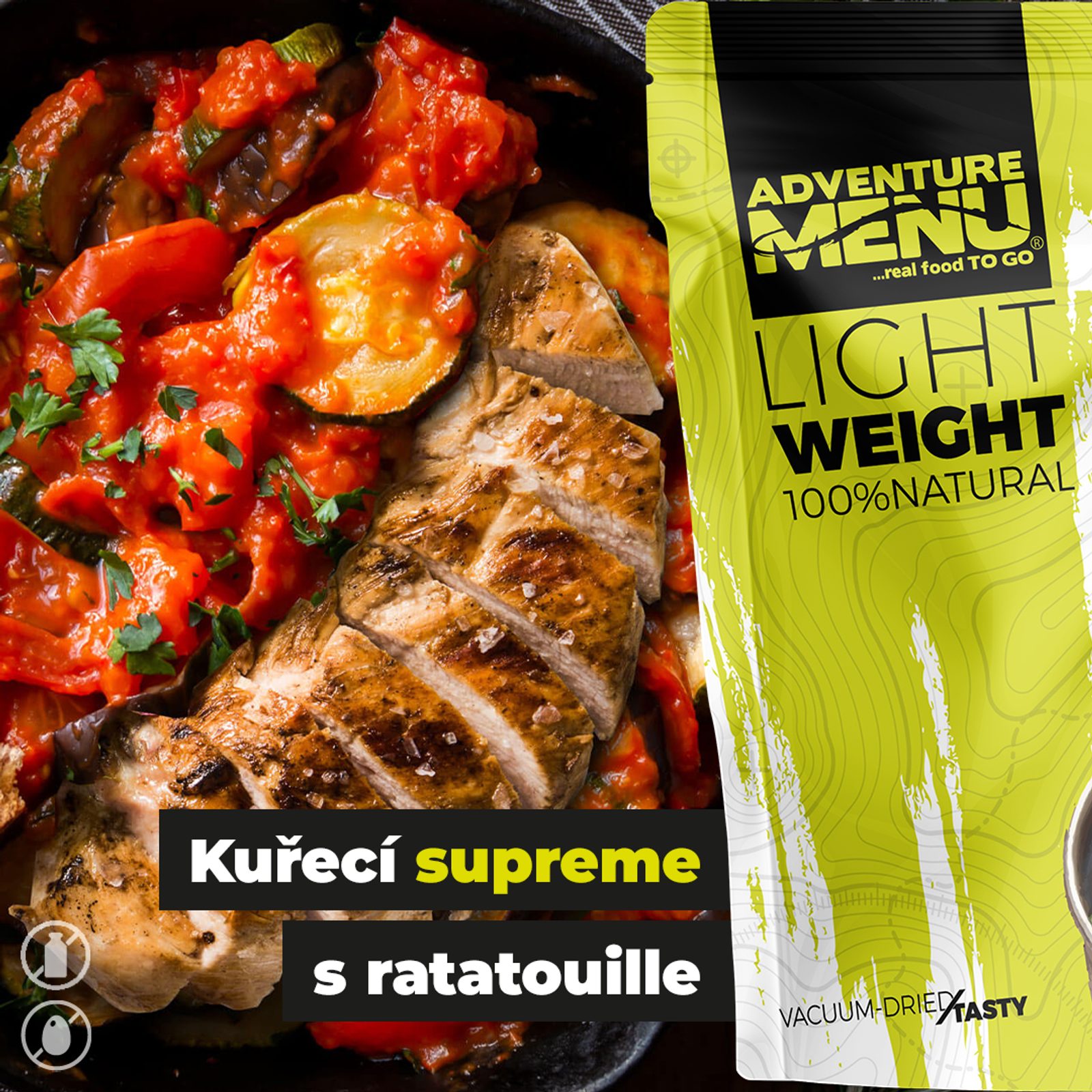 Nečekej úhledně naskládané plátky zeleniny, jako to uměl myšák ve filmu. Co ale můžeš čekat je skvělá chuť čerstvé zeleniny vařené v páře spolu s rajčatovým protlakem a směsí koření. Lightweight Adventure Menu stačí jednoduše zalít horkou vodou.