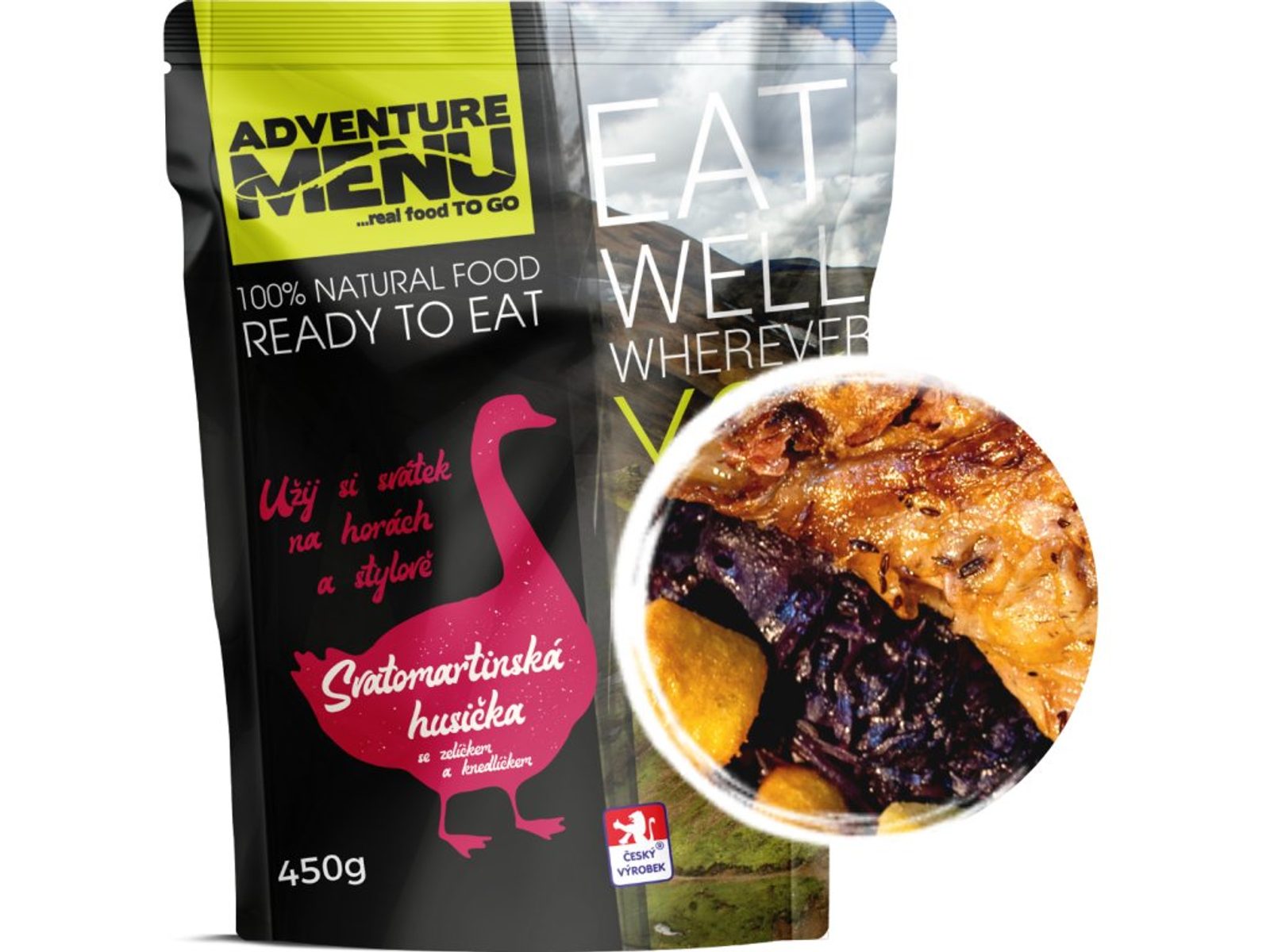 Tradice je třeba ctít, a tak se do Adventure Menu vrací limitovaná edice svatomartinské husičky se zelíčkem a knedlíčky. Vychutnej si sváteční hody v přírodě s 450g porcí vykoštěného husího stehna na páře pečeného, s poctivě ručně dělaným zelíčkem sladěného a špalíčky z bramborového těsta doplněného.
