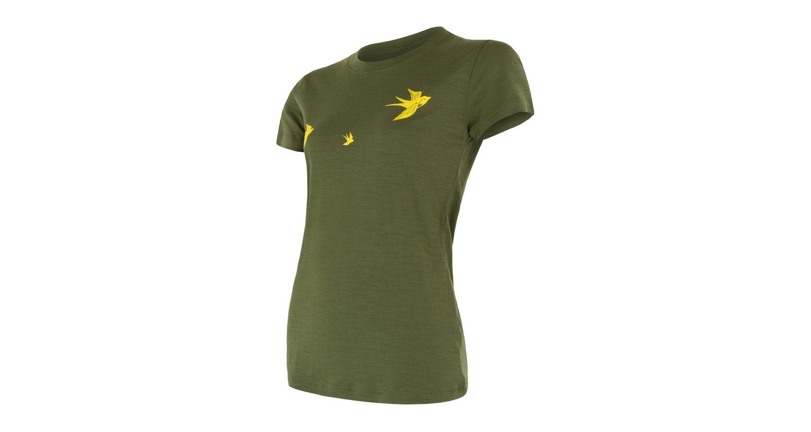 Dámské tričko Merino Active Performance Tee s potiskem vlaštovek z vysoce kvalitní vlny Merino z Nového Zélandu.