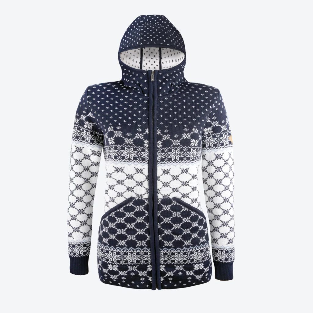 Dámský sportovní svetr v severském stylu nahradí díky svému prodlouženému střihu bundu, nebo kabátek. Prémiová příze Schoeller z komobinace čistého merina a akrylu dělá z tohoto svetru skvělé funkční oblečení pro outdoorové aktivity i běžné nošení. 2 kapsy v přední části.