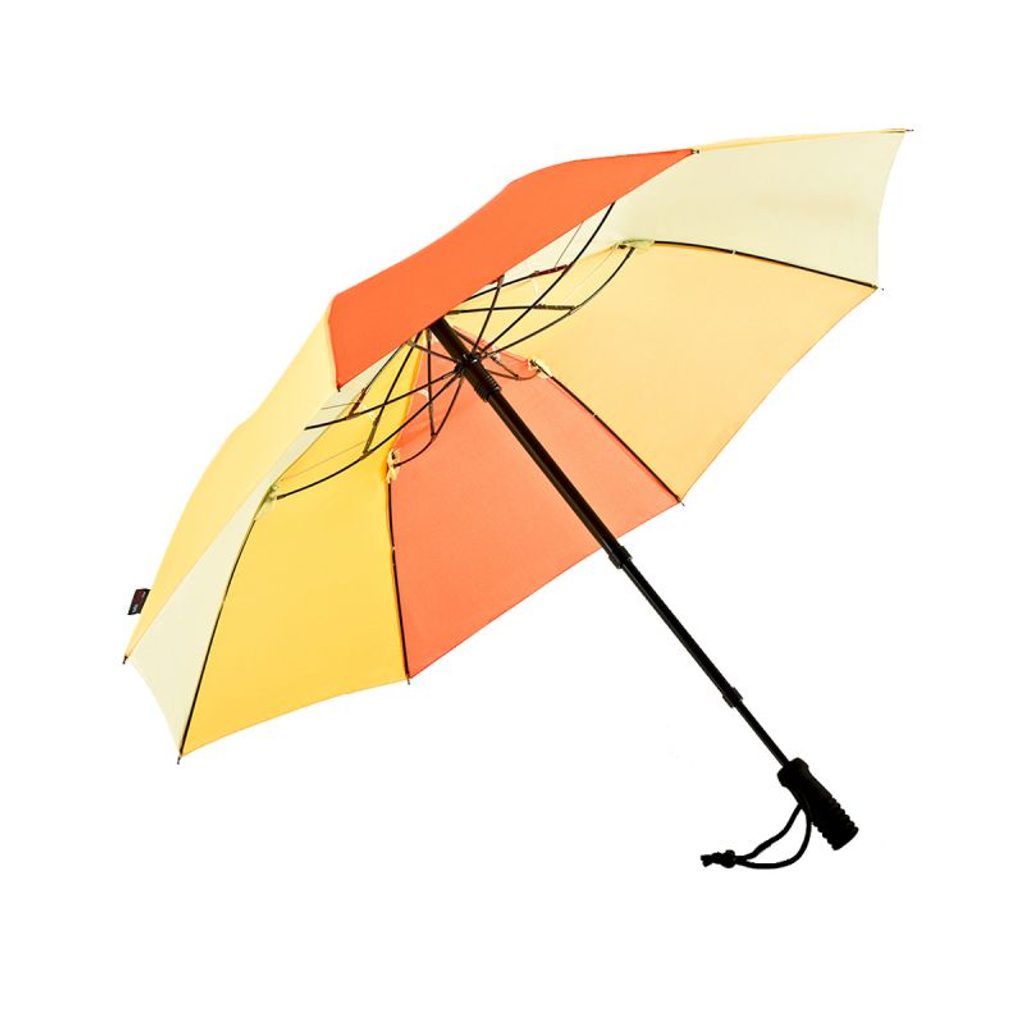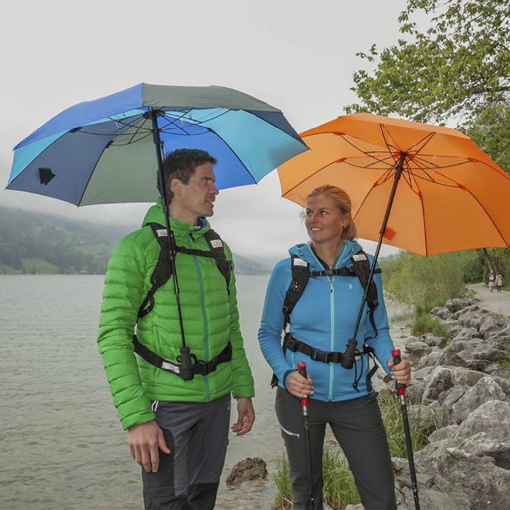 Kompaktní trekový deštník bez rukojeti "teleScope handsfree" je ideální pro každého, kdo chce mít volné ruce, když je venku v dešti a komu záleží na malé velikosti balení: pro turisty s trekovými holemi, stejně jako pro lesníky, zahrádkáře nebo také do přírody. fotografové. Zvláštní výhoda: Vláknitou tyč kapesního deštníku lze dvakrát prodloužit až na maximálně 96 cm, zaaretovat v každé výškové poloze a upravit podle vlastní výšky. Pomocí přiložených příchytných spon jej pak lze připevnit vlevo, vpravo nebo šikmo vpředu k nosným popruhům batohu a orientovat proti směru, odkud přichází déšť, vítr nebo slunce. Elastický nosný popruh na rukojeti slouží jako flexibilní fixace na bederním pásu. Pokud není k dispozici žádný batoh, lze deštník připevnit také na praktický pásový systém EuroSchirm®. Handsfree "teleScope" se složí velmi krátce a najde si tak pohodlně místo i v batohu nebo v tašce. Další výhoda: Jako běžný deštník je handsfree trekingový deštník také skvělým společníkem do města a na každodenní použití.