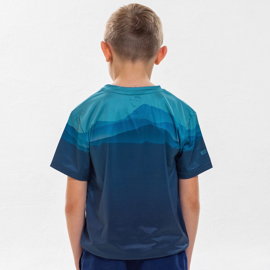 Dětské funkční tričko je maximálně pohodlné a prodyšné. Siluety našich krásných hor v červánkách/tajemných barvách bude slušet každému malému sportovci.