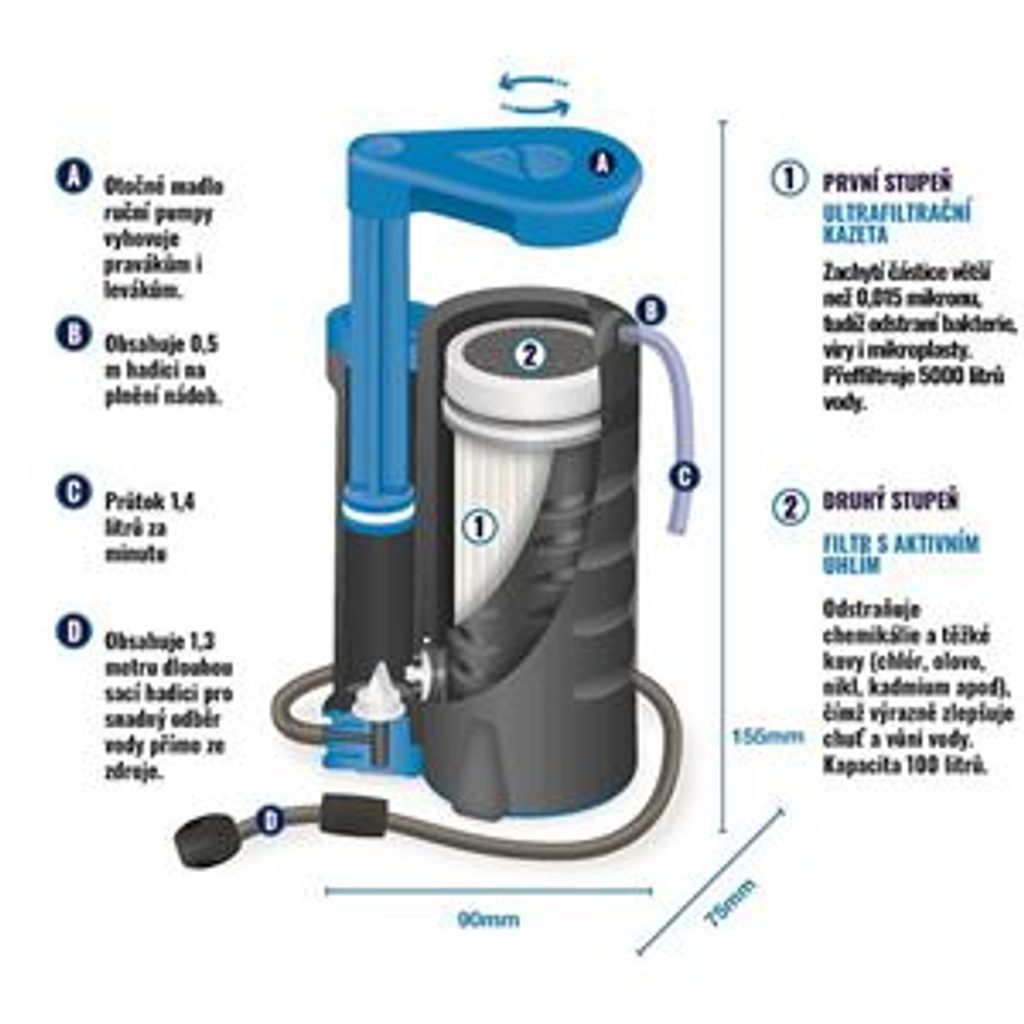 Robustní ale přesto kompaktní vodní filtr, který odstraní z vody spolehlivě 99,99 % všech bakterií i virů. Zároveň v ní dramaticky snižuje obsah těžkých kovů, chemikálií i mikroplastů.