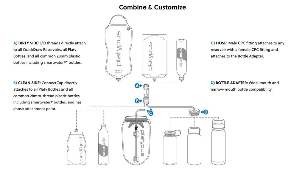 Pro čištění stačí filtr z dutých vláken pouze protřepat nebo provést zpětné propláchnutí bez nutnosti použití dalších nástrojů. Filtrační patrona je kompatibilní s dalšími lahvemi a hydrovaky Platypus, což z něj činní ideální systém pro aktivní pohyb v přírodě.