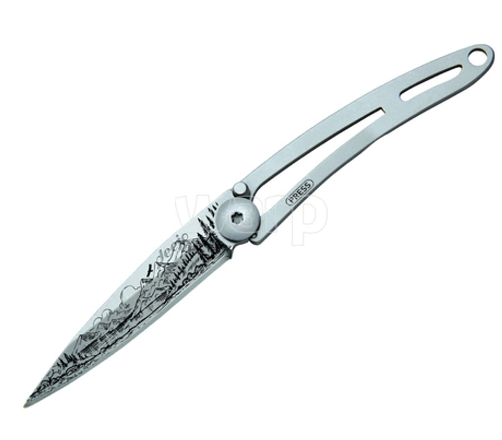 Stylový ultralehký nůž Deejo ze série Naked ve verzi 15 gramů a laserem vytetovaným motivem horské scenérie.