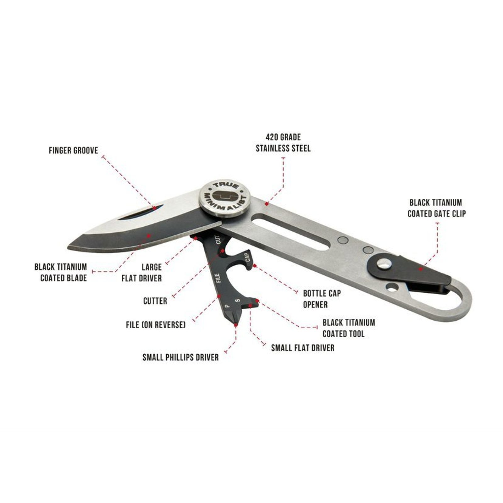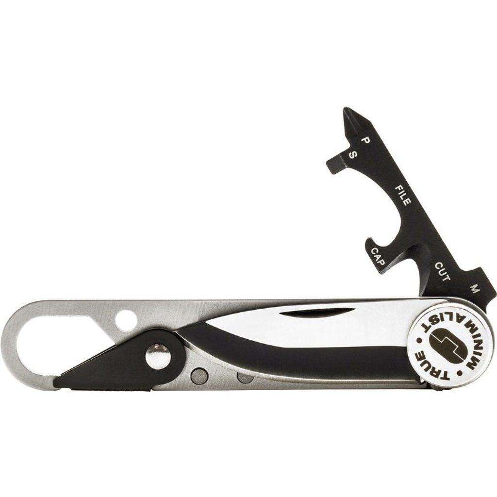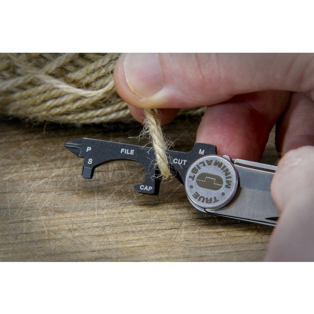 Multitool Minimalist od britské firmy True Utility je určen těm, kteří chtějí nosit po kapsách skutečně jen minimum. Lehký a tenký kapesní multitool z nerezové oceli, potažené vrstvou černého titanu, nabízí 7 funkcí - vedle zavíracího nože má křížový šroubovák, malý a velký plochý šroubovák, otvírák na lahve, pilník a řezač drátu. Pomocí karabinky ho můžete připnout ke klíčům nebo k batohu.