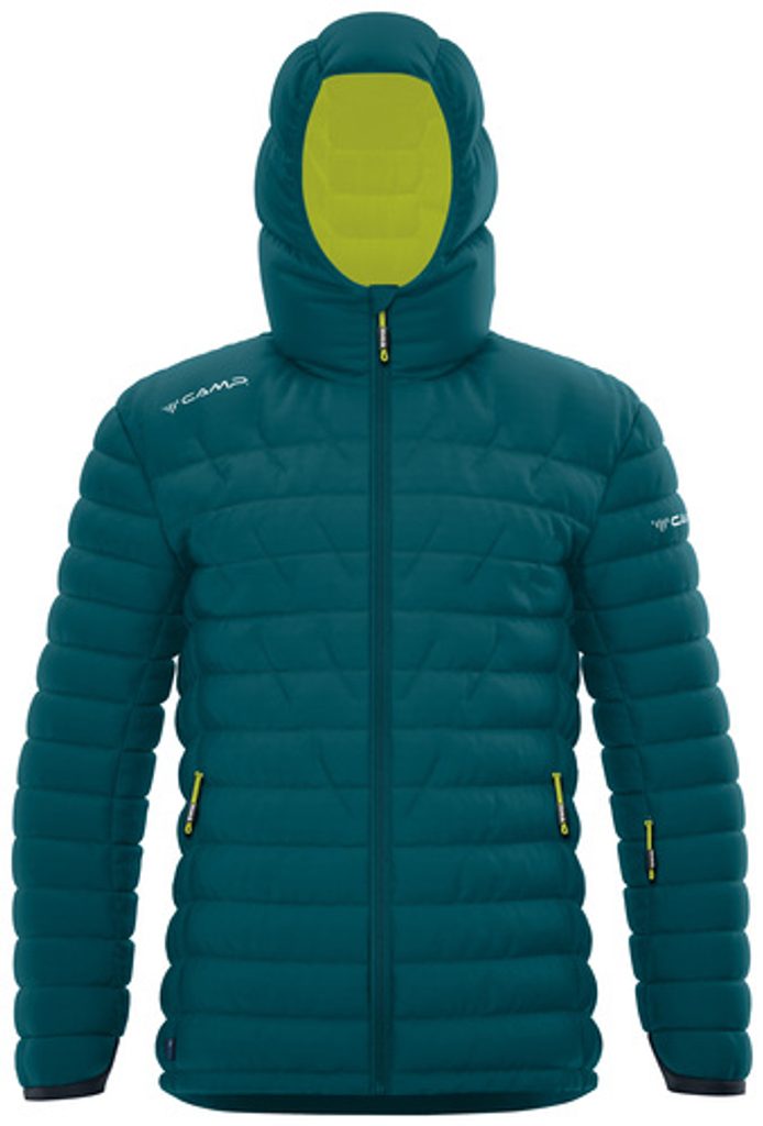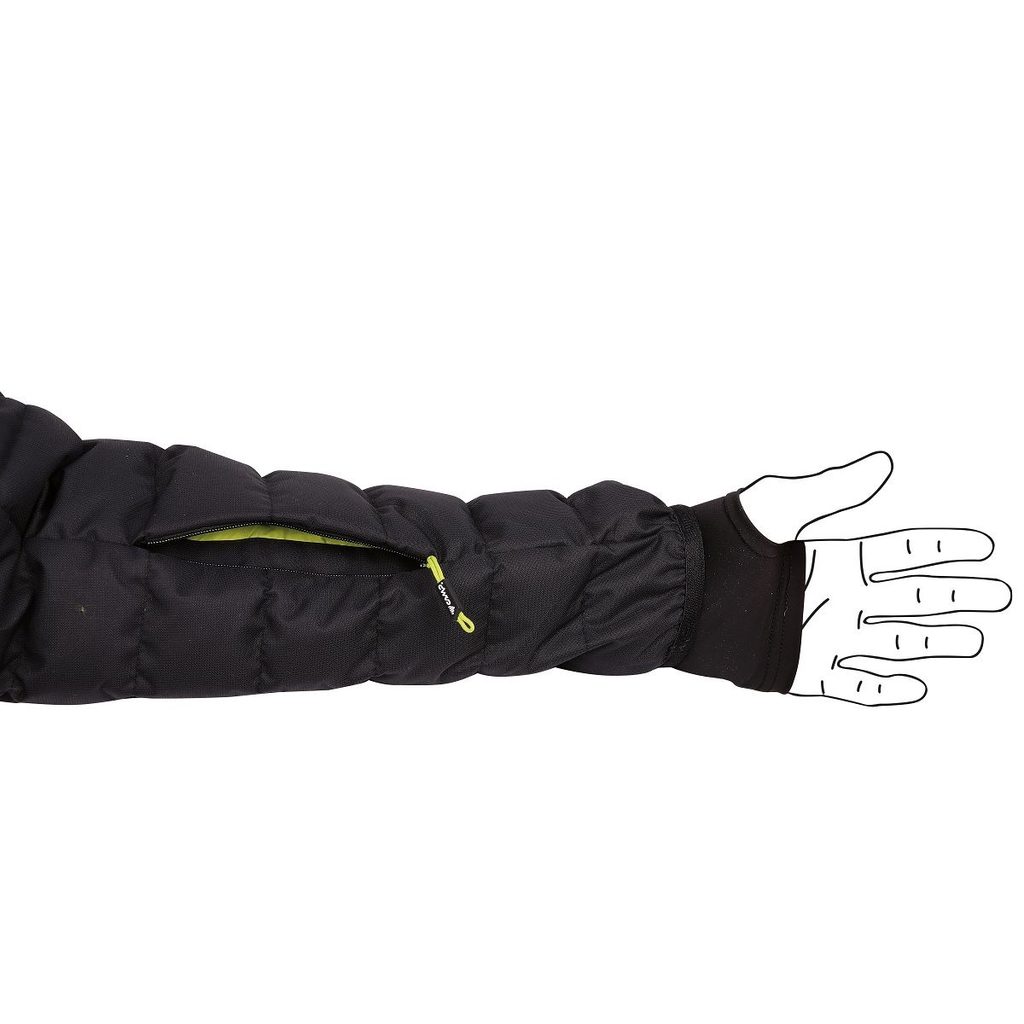 Prémiová bunda s bílým kachním peřím, elastickými boky pro větší pohodlí a pevnou kapucou, vhodnou i přes helmu.