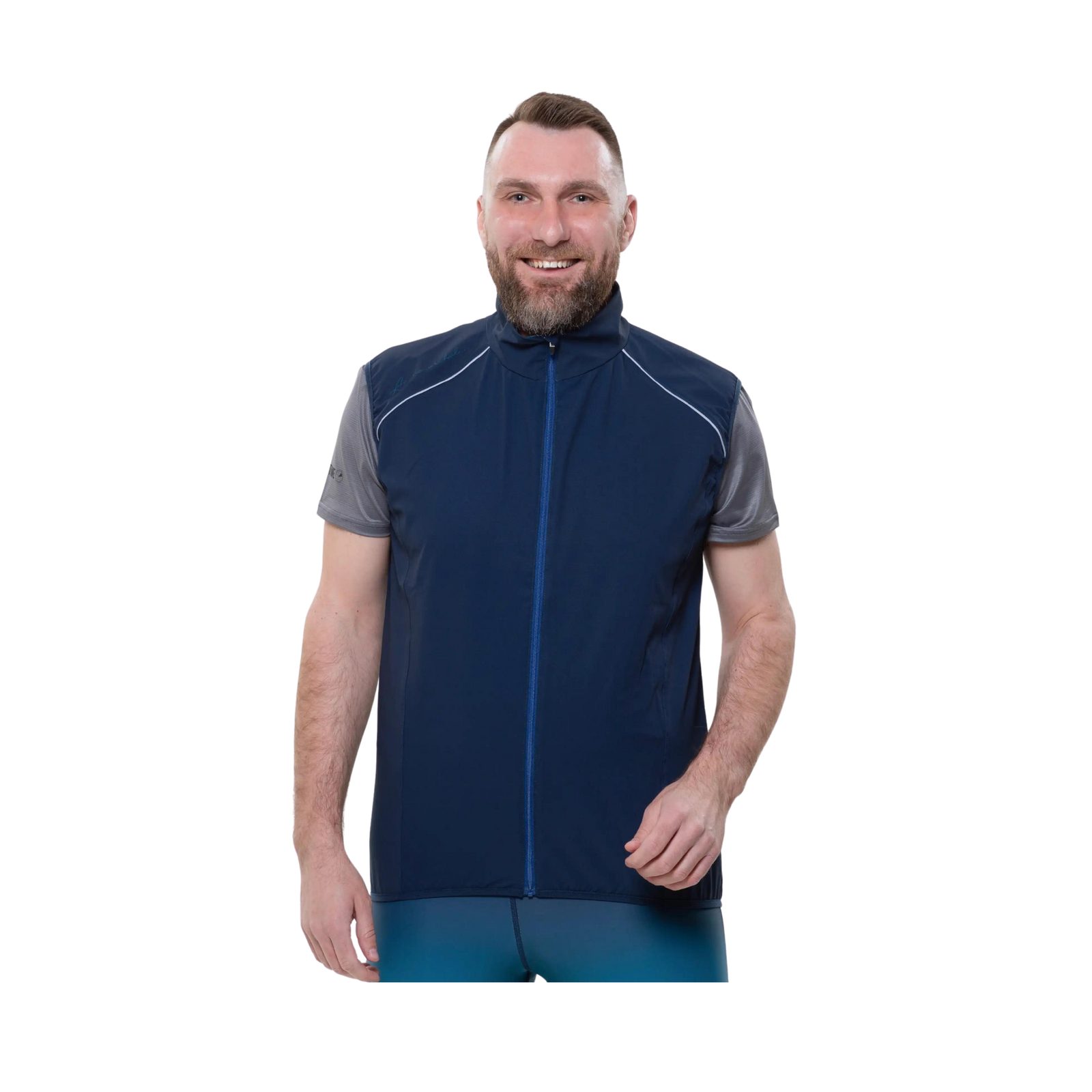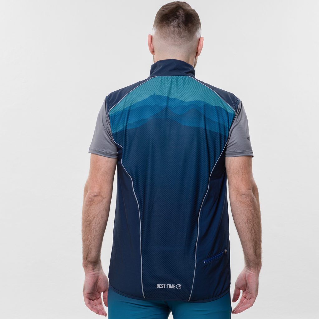 Pánská sportovní vesta je skvělým parťákem do větrných dní. Materiál je hustě tkaný a voděodolný, ale zároveň elastický, aby neomezoval v pohybu. Zadní díl je z elastické prodyšné síťoviny, aby nedošlo k nadměrnému pocení.