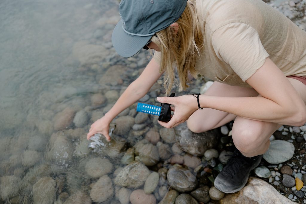 Uzávěr na lahev s vodou, který promění lahev na vodu se širokým hrdlem na rychle tekoucí filtr připravený k okamžitému použití.