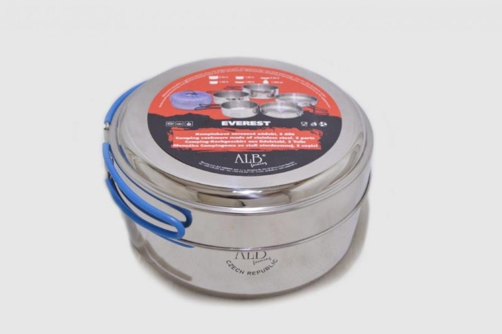Nerezové nádobí největšího objemu určený zejména pro rodiny s dětmi. Vyrobeno z kvalitního nerezu CrNi 18/10 s povrchem vně leštěným, uvnitř broušeným. Pánev i misky mají lemovku a sklopné držáky.