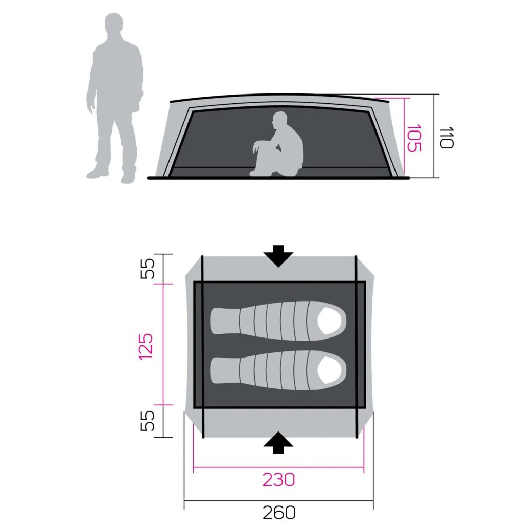 Ideální prostorný stan pro kemping, turistiku a pobyt v přírodě. Stabilní a velmi prostorově komfortní stan má tunelovou vnější konstrukci na duralové tyče a 2 velké boční vchody s 2 prostornými apsidami. Oba vchody mají celorozepínací dveře s částečným odvětráním. 4 větrací otvory zajistí dostatečnou ventilaci celému prostoru.