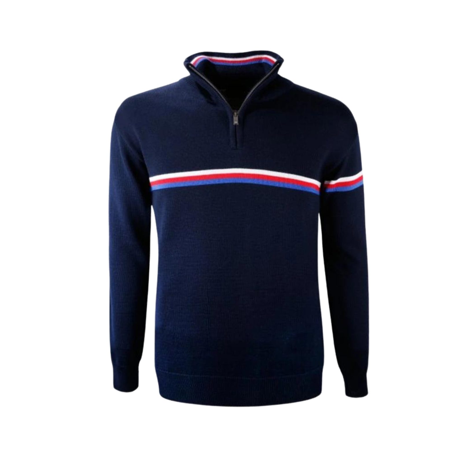 Jednodnobarevný svetr ozdobený trikolorou. Jedinečná kombinace funkčních vláken pružného úpletu se postará o vaše pohodlí.