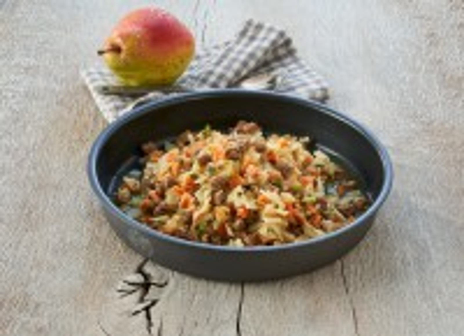 Tradiční irský pokrm, chuťově výrazný, velmi bohatý a energeticky hodnotné složky - brambory, jehněčí maso a zelenina; příprava přidáním vroucí vody do originálního sáčku; 1,5 porce, 160 g (v transportním stavu), 710 g (hotový pokrm), 608 kcal.